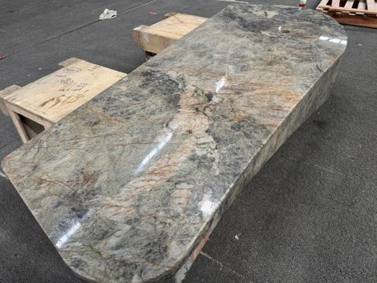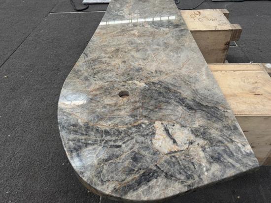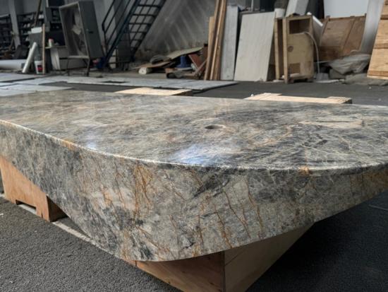 Eksotik Kuarsit Cielo Meja resepsionis dari Brasil, menampilkan alas berwarna biru keabu-abuan dengan urat emas yang mencolok. Furnitur batu kustom yang tahan lama dan mewah.