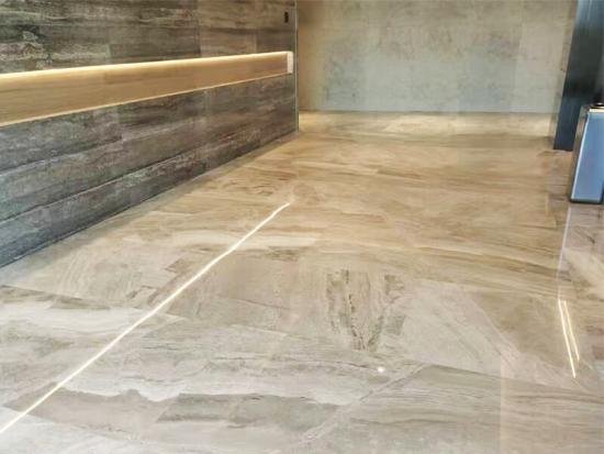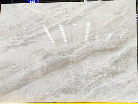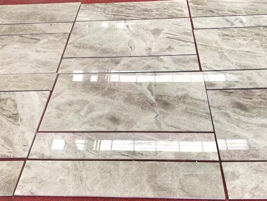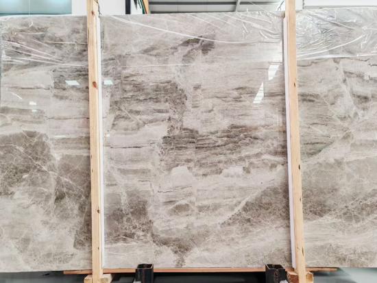 Batu ini memiliki dasar abu-abu yang elegan, sering kali diselingi urat-urat halus berwarna putih atau cokelat muda, menciptakan pola alami yang unik untuk setiap lempengan. Sebagai marmer alami, batu ini memiliki sentuhan dingin dan nuansa kokoh dan kokoh, yang menunjukkan keaslian asalnya.