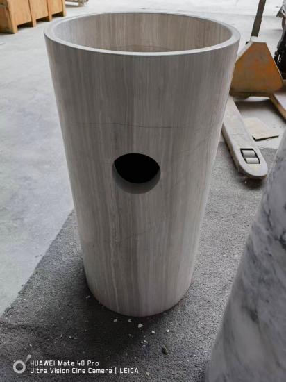 Ini wastafel berdiri bebas dibuat dari sepotong bahan alami Kayu Putih marmer Nuansa putih lembut dan tekstur serat kayu abu-abu yang halus terjalin sempurna, memadukan keindahan alam dengan kemewahan yang bersahaja. Desain silindrisnya yang ramping menghemat ruang dan melengkapi gaya minimalis dan mewah dengan sempurna.