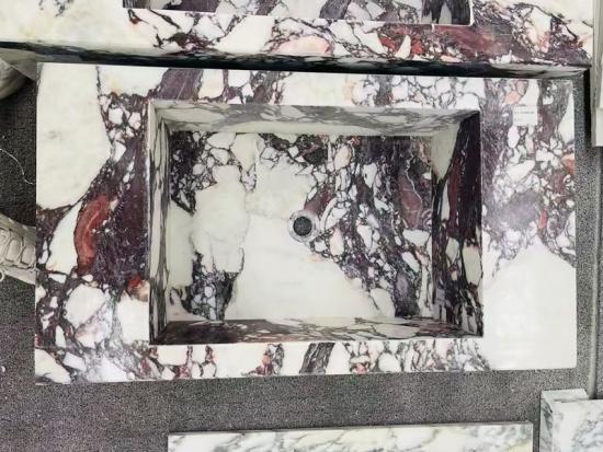 Aplikasi Serbaguna & Keunggulan Fabrikasi Koleksi kami menampilkan keserbagunaan luar biasa dari material ini, yang bertransisi dengan mulus dari bahan mentah. Lempengan Viola Calacatta hingga produk jadi yang istimewa. Dengan tim fabrikasi profesional kami, kami menyediakan: