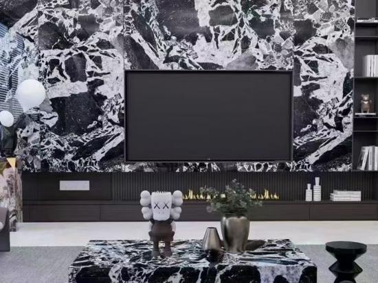 Dinding Fitur: Kontras tinggi Dinding latar belakang TV marmer dan panel lobi yang serasi.