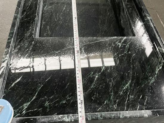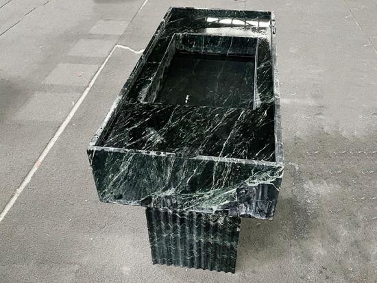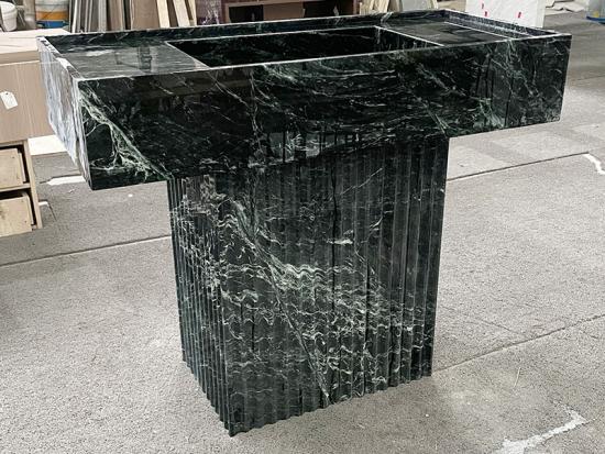 Wastafel terintegrasi berdiri bebas dari marmer hijau Prada premium dengan alas beralur, konstruksi satu bagian tanpa sambungan, ideal untuk kamar mandi hotel mewah & hunian.