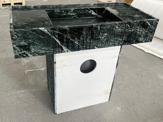 Dibuat dari bahan premium Marmer hijau Prada dengan desain alas beralur, ini wastafel berdiri bebas terintegrasi menghadirkan kemewahan abadi untuk proyek kamar mandi hotel dan hunian kelas atas.
