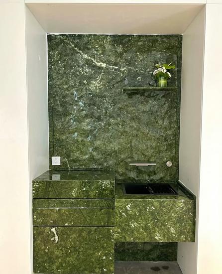 Marmer Verde Ming sering digunakan untuk bagian atas meja rias, aksen dinding, lantai, dan elemen dekoratif: