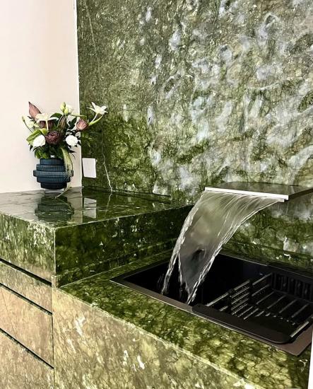 Marmer Verde Ming Nuansa hijau elegan dan teksturnya yang indah menjadikannya pilihan populer untuk berbagai proyek desain interior. Warna dasarnya yang rimbun seperti rumput, dihiasi urat-urat hijau tua yang berkelok-kelok dan bintik-bintik putih halus, memadukan vitalitas alami dengan kemewahan yang bersahaja, langsung menjadi titik fokus visual di setiap ruangan.